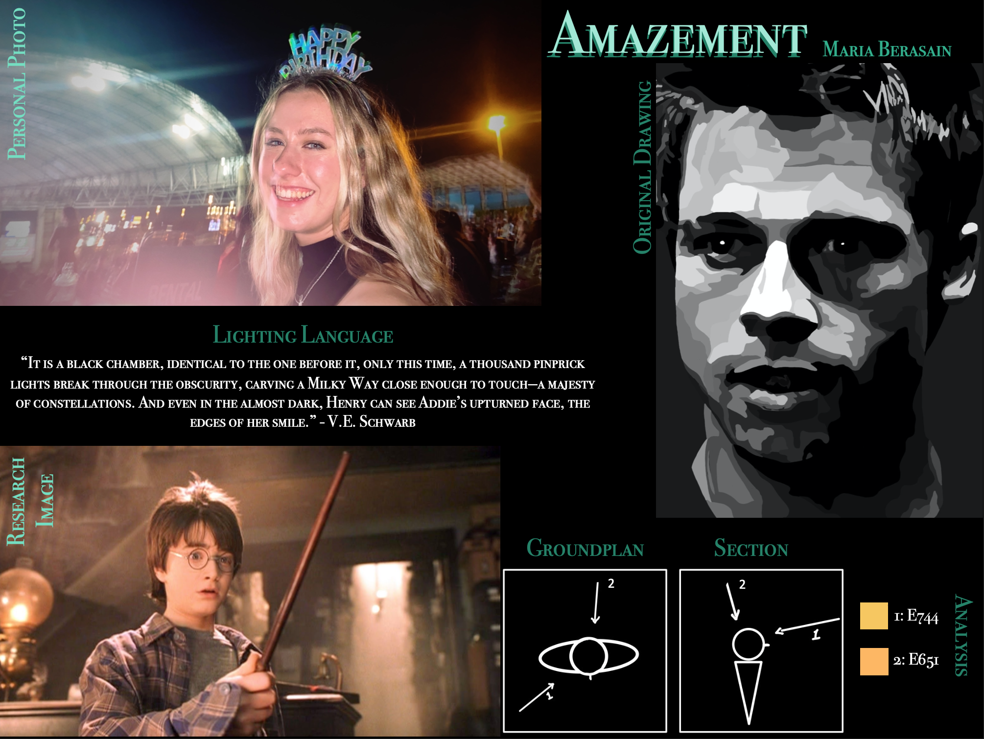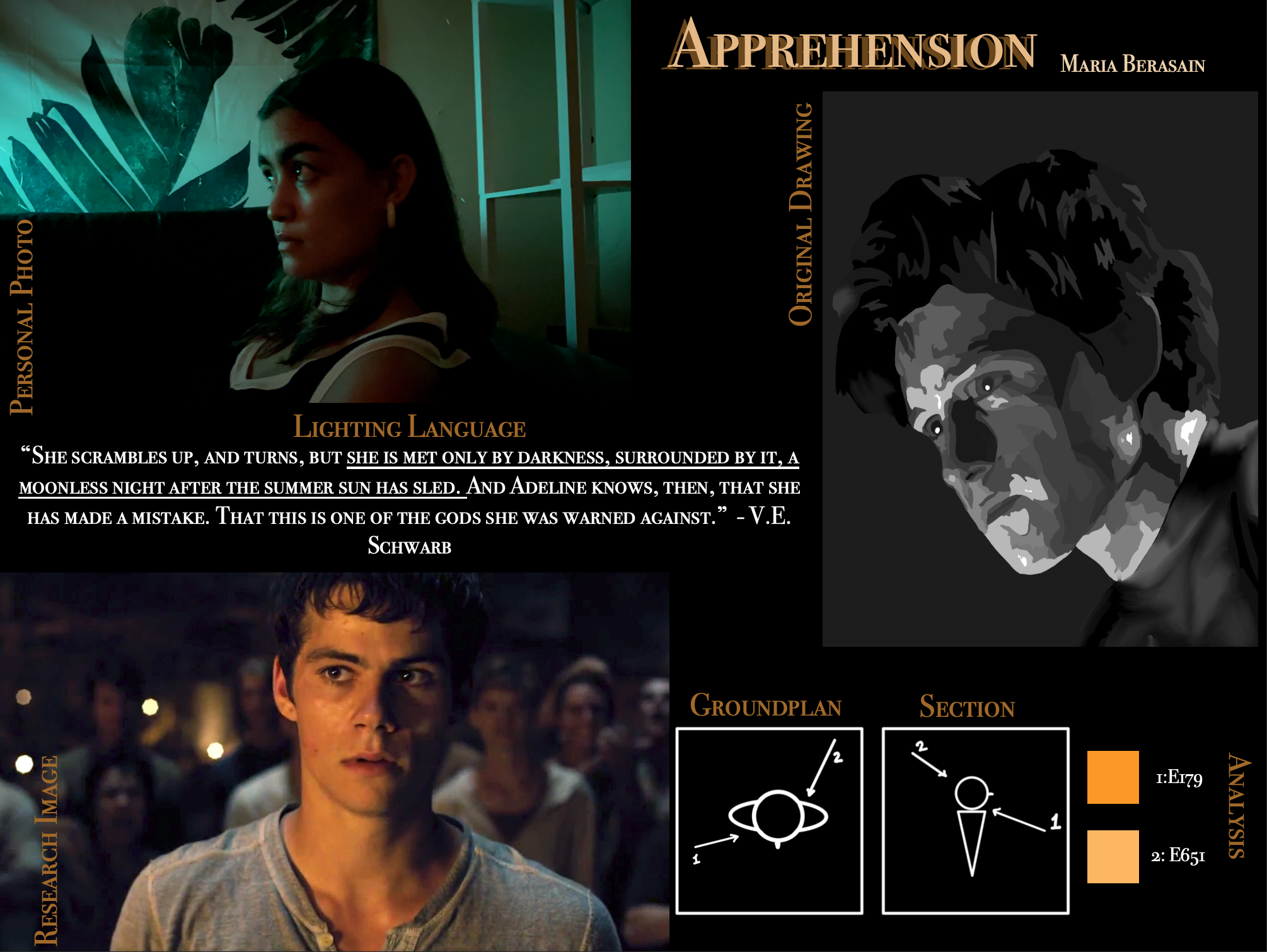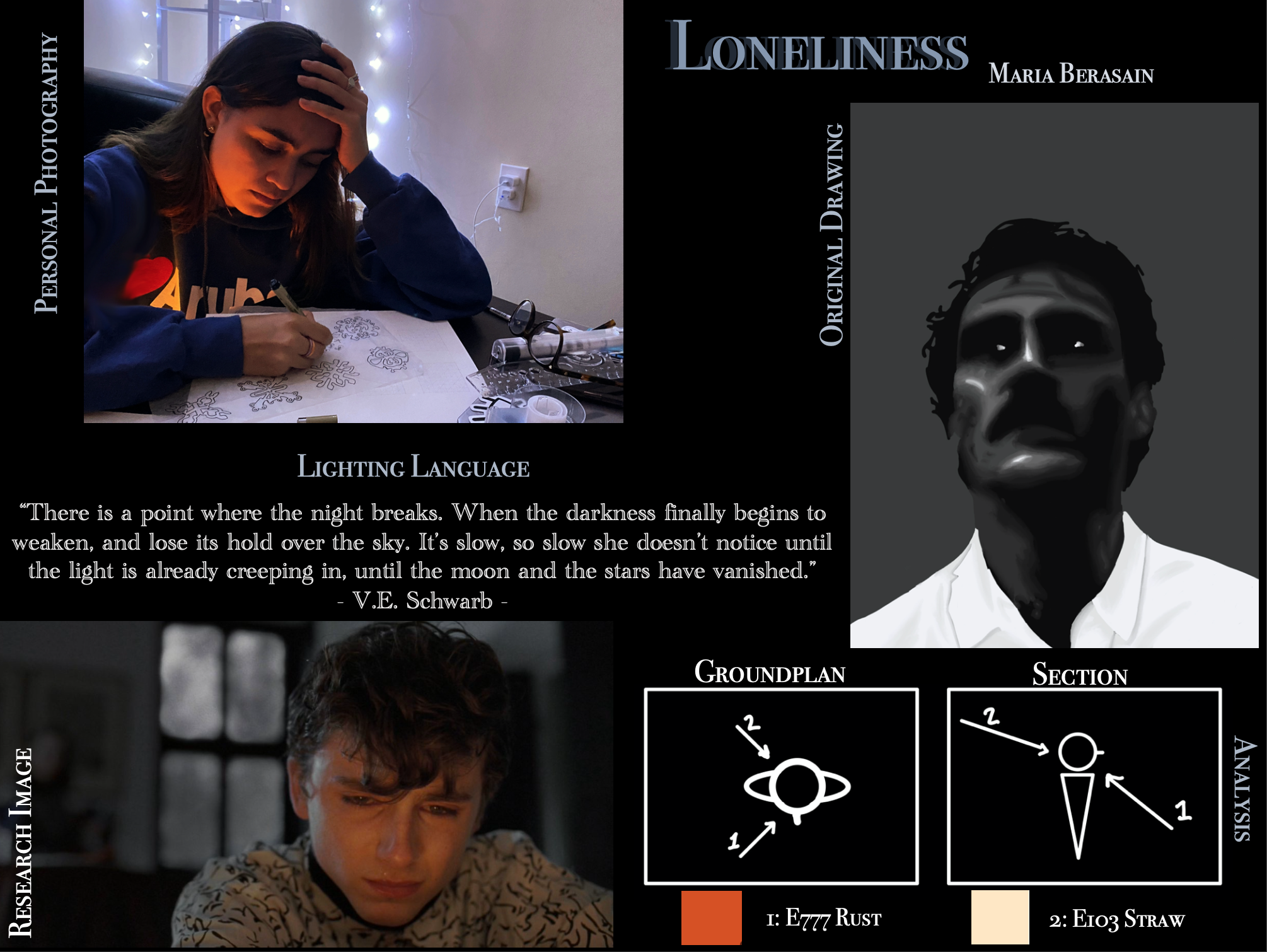 These four compositions form a journal of light studies that reflect a diverse range of situations based on the emotions of Loneliness, Apprehension, Amazement and Anger. Each composition includes imagistic lighting language from published books, a research image and its analysis besides it, personal photography show in the top left of the compositions and a white on black original drawing made in procreate.