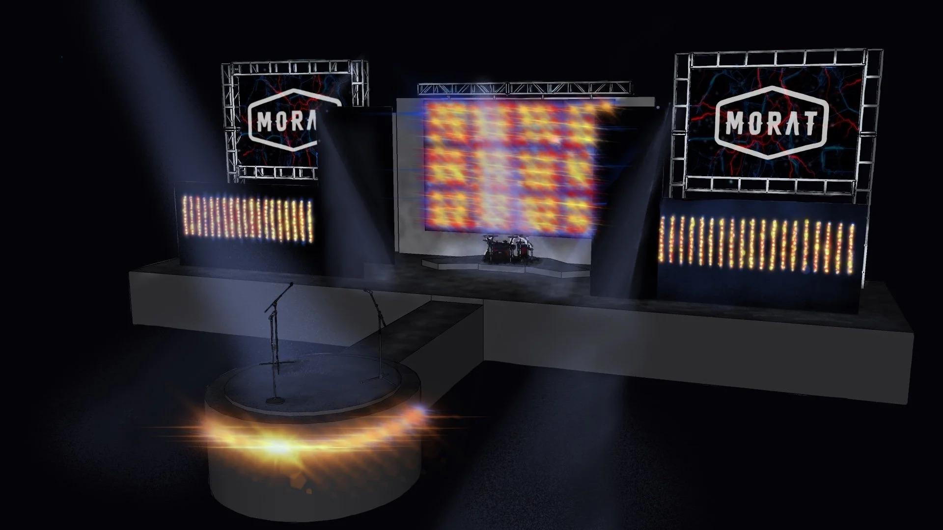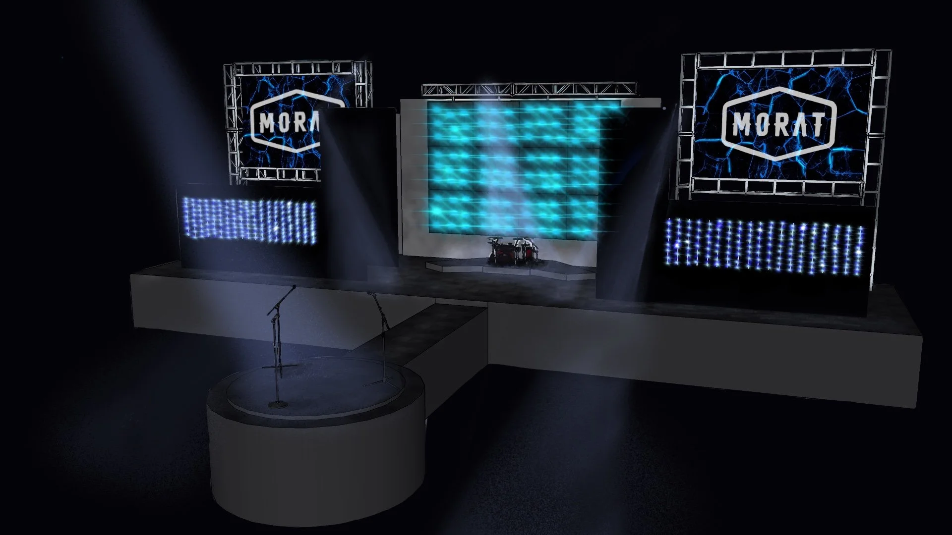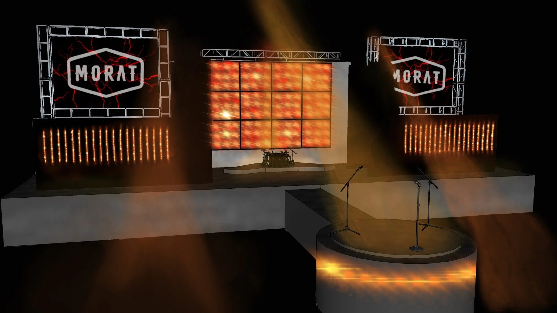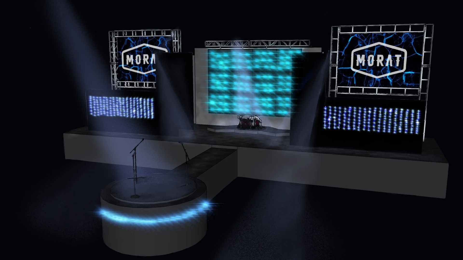 This is a concept design for a Colombian band called Morat. There is a circular platform that would be surrounded by the fans that could be raised and move in a circle as the band plays. The led lights strips on both side of the wall would change colors throughout songs. My idea is that the lighting would seems as it was controlled by the drums and even time the beat change the way the lights worked and were colored would change.